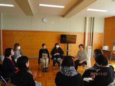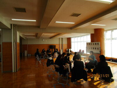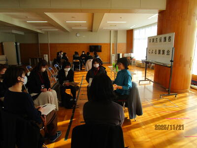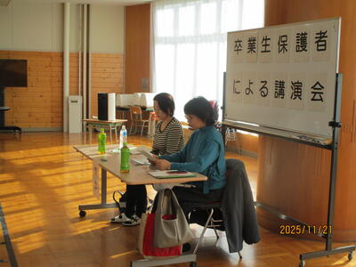 11月21日(金)にPTA企画部主催による「卒業生保護者による講演会」が行われました。講師には今年3月に卒業した2名の保護者をお招きし、卒業後の進路に向けて在学中に取り組んできたことや福祉事業所を見学する際の視点等について、ご自身の体験談をまじえながらご講演いただきました。講演会の後半は、グループに分かれて交流し、より具体的な話題で意見交換ができ、和やかな雰囲気の中、行われました。