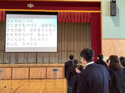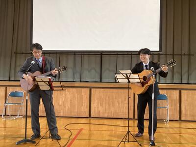 また、生徒へのプレゼントとして、「サンタが街にやってくる」と「勇気100%」を、校長先生と副校長先生がギター演奏をしながら披露してくださいました。会場は手拍子と笑顔に包まれ、温かな雰囲気の中で終業式を終えることができました。